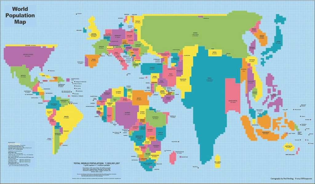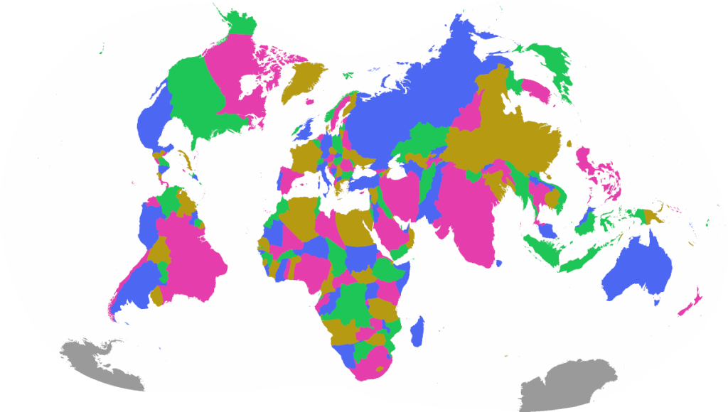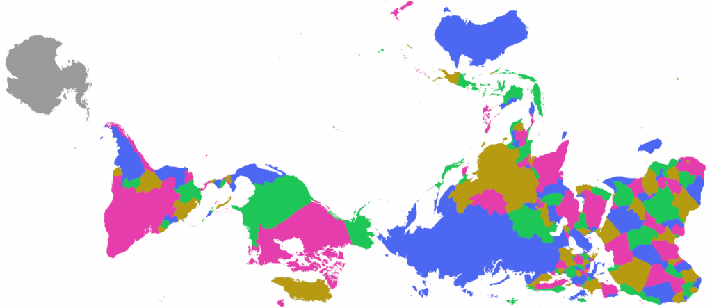 Such maps exist, of course, and they’re called cartograms. They are rarely used for actual geographic information, though. The extreme angular distortion and discontinuity they introduce typically makes them completely unusable for anything but making a point about the global distribution of whatever they’re portraying. Also, for some reason, global cartograms never seem to show statistics at anything finer than the national scale, which is a real shame when the biggest countries on the map are vast, heterogeneous realms like China, India, and the US.
