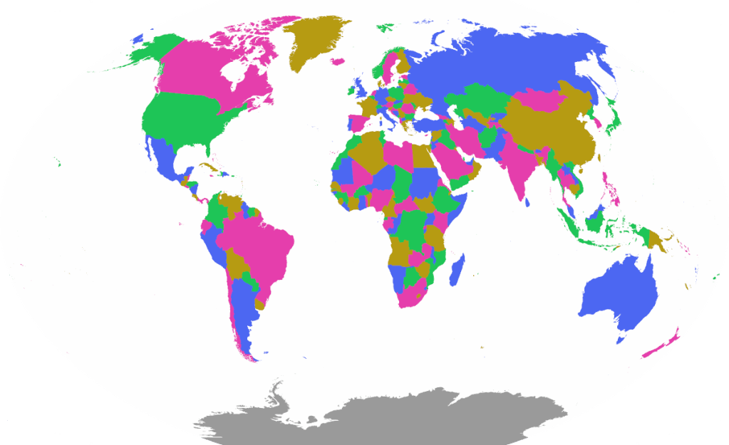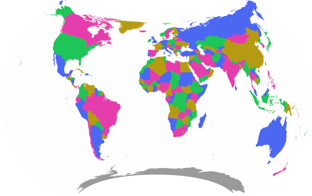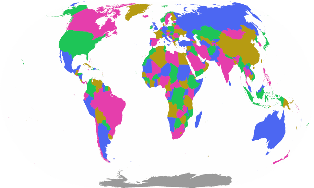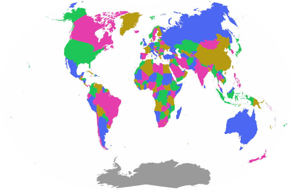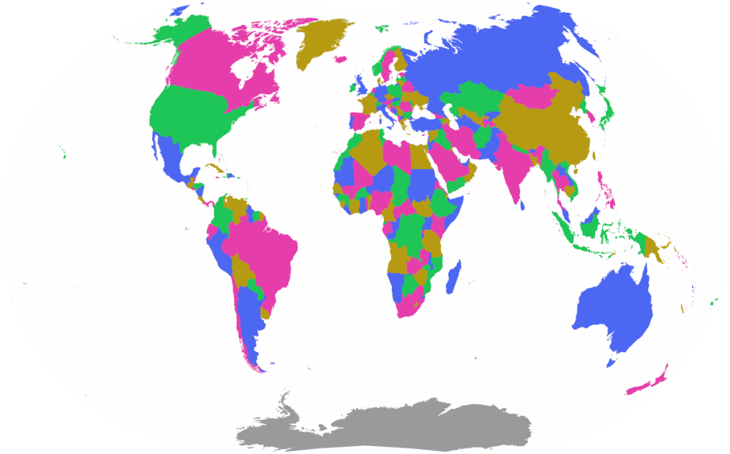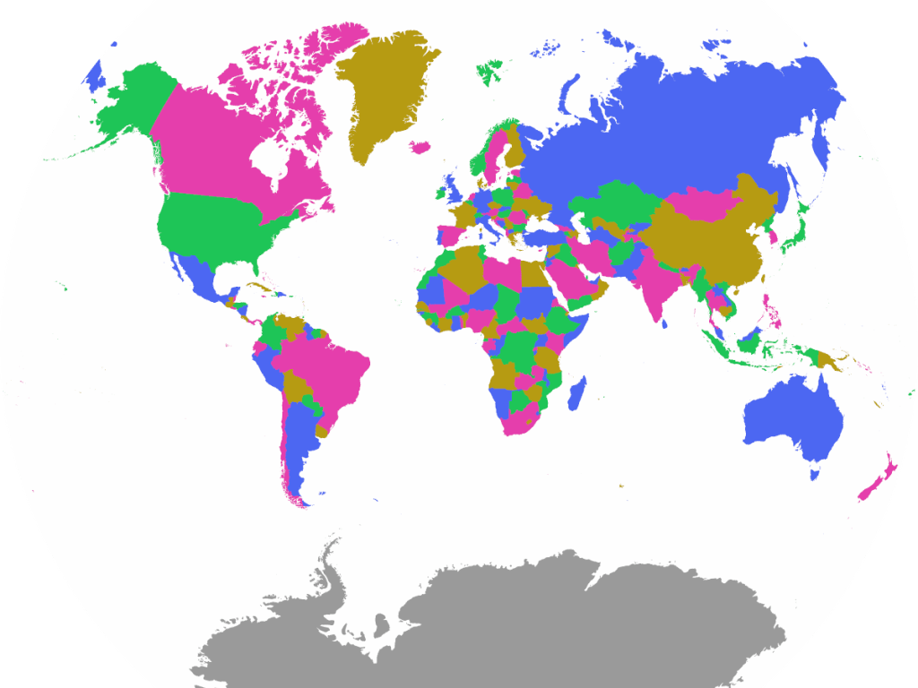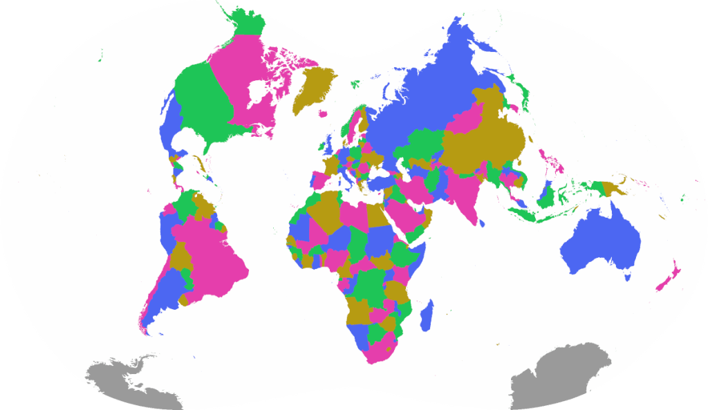 It might look something like this. Note that the vast areal distortions of the Mercator projection don’t really impede the ability of the map to communicate its information; they just make Greenland, Canada, and Russia take up an unnecessary amount of vertical space. Also note that most of this map (~65% ignoring margins) is whitespace: the oceans. They convey no information, as they represent no category.