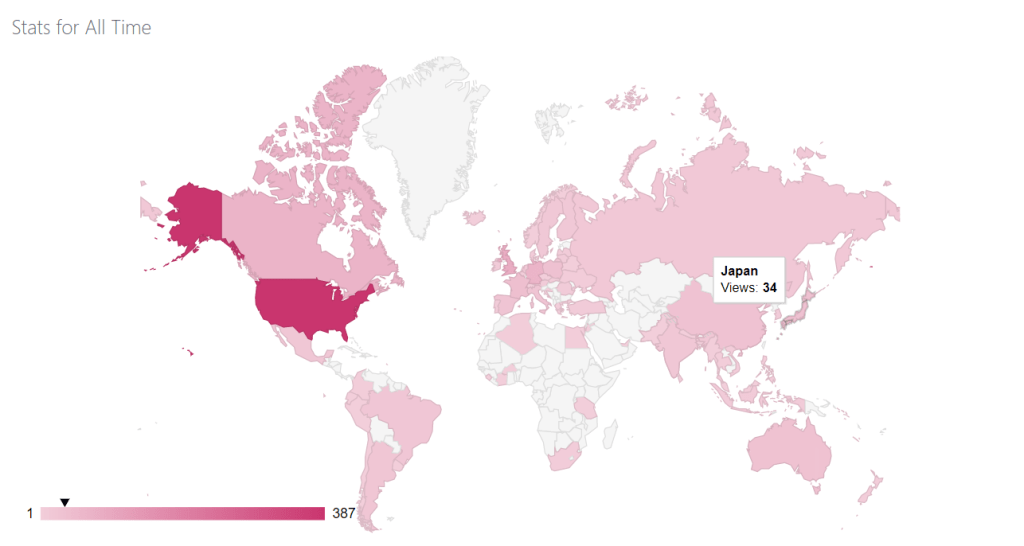 Consider the problem of telling a wobsite owner which countries they get the most traffic from. The simplest solution is a table, listing each country and the number of hits the wobsite has gotten from it. There are hundreds of countries in the world, though, and even a WordPress blogger who only writes about cartography and flat earth theory would quickly require a table 70 rows long. Graphs are a great way to make tabular information more palatable, and the best choice for datums like this would normally be a pie or bar chart. Since the categories are countries, though, there’s a shortcut that one can exploit to make the information easier to read: people already associate a position and shape with each country, so use the x and y axes to indicate category and let the color axis indicate number.