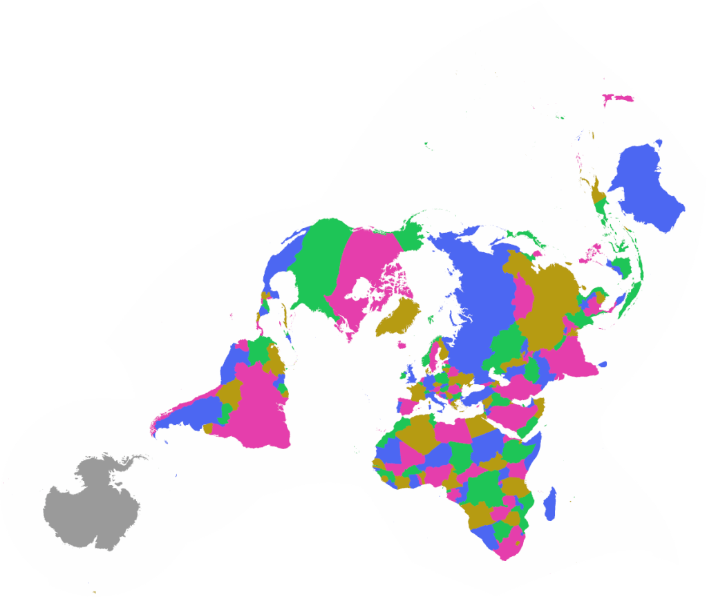 And yet, this is the twenty-first century. The Mayan apocalypse has come and gone! There are over seven generations of Pokemon! Cartographers need not bow to these computational constraints any longer! The time has come to shake free of these arbitrary lines of latitude and longitude, to throw off these circles and hyperellipses and power functions, to deny control over our maps to these unchallenged assumptions that physical area is the most important quantity of a country, that Antarctica is unimportant and negligible, and that the International Dateline is the end of the world! The time has come for the Danseiji projections.