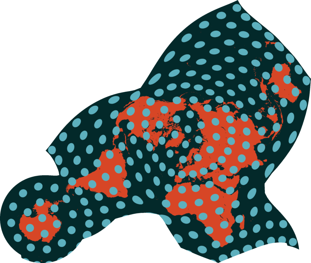 The Danseiji (/dɑnˈseɪdʒi/; from “弾性 地”) projections are the optimal map projections, in the most literal sense of the word. Each one is represented by a fine mesh of vertices that represent an elastic spherical surface. That surface is allowed to come to rest, thus reducing the distortions of size and shape throughout the mesh. The core of the Danseiji projection’s strength comes from the fact that it has no equations. It is free to be anything or anyone, regardless of how ungeometric or irregular that may be. This family of maps can be easily adapted and applied to any purpose. Comparing areas? Showing statistics? Brainwashing children? There’s a Danseiji projection for you!