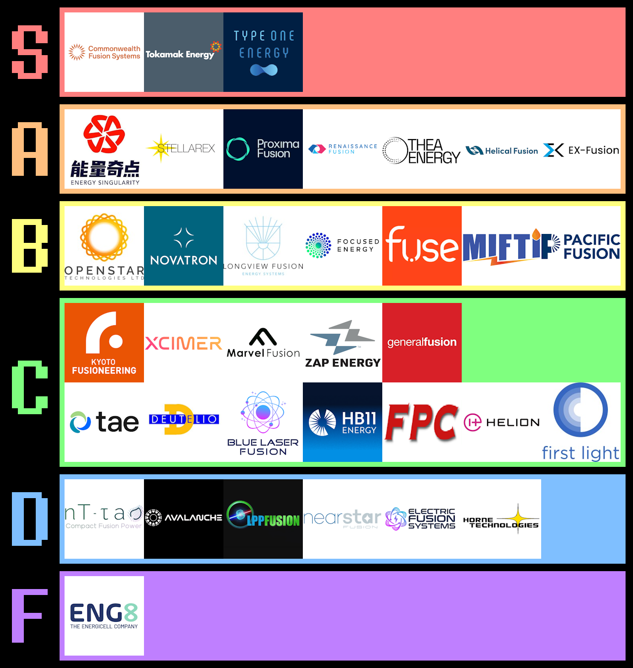 ENG8 is a Gibraltar-based company pretending to have built a cold fusion reactor. They claim to have achieved an engineering gain of 5, and that this result was verified by the workplace safety certification organization UL Solutions. Aside from the fact that cold fusion was disproven decades ago, UL Solutions has also denied any such verification. I’m making them the only F-tier company because of the whole not being real thing. At least the other fusion companies will probably fail in good faith.