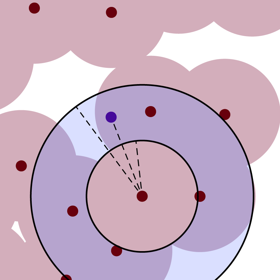 I admit I was still surprised to see it perform so poorly, since the annulus system feels like it should efficiently focus on peripheral regions where there are likely to be voids while ruling out areas that have already been covered extensively. However, after thinking about it more, I’ve realized that these annuli are actually an especially inefficient way to partition the domain. Unlike the grid cells that I use to partition the domain in the empty-cell-sampling algorithm, the annuli are heavily overlapping, meaning that you end up having to rule out most parts of the domain multiple times.