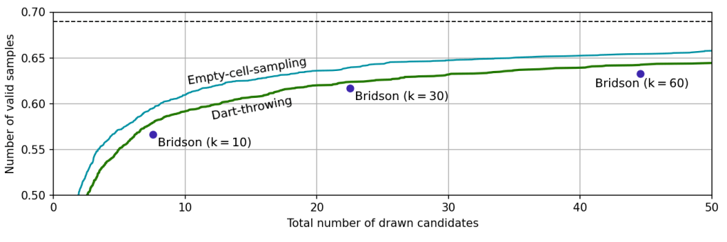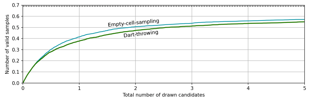 When the first candidates are drawn, almost all of the domain is still valid, so the acceptance rate is nearly 100% and the number of valid samples increases rapidly. As the domain becomes more crowded, though, candidates start to be rejected and the growth rate slows down, eventually asypmtoting to 0.69. As expected, the more complicated empty-cell-sampling method is more efficient than pure dart-throwing; it requires fewer candidates for the same number of valid samples. The difference is pretty modest, though. Since only about one third of the cells actually end up filled in a maximal distribution, excluding them from the sampling domain doesn’t save you all that much time.