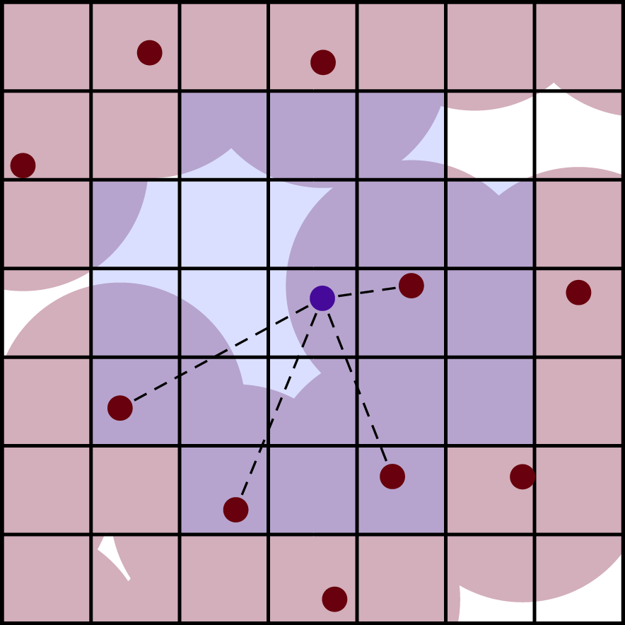 Twoth, he divided the sampling domain into a grid to help with checking the validity of sample candidates. Each grid cell has a reference to all of the samples it contains, if any. This means that, rather than checking the distance to every previous sample, you only need to check the distance to the samples contained in the nearby grid cells. This makes the algorithm linear-time. Bridson scaled his grid so that the cells had diagonals equal to Rmin, ensuring that each contains no more than one sample.