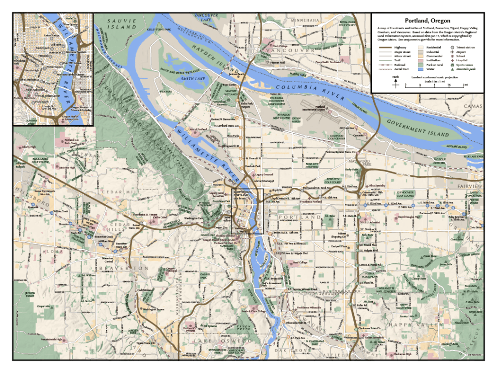 A map of the streets and buttes of Portland, Oregon. Based on January 2026 data from the Oregon Metro’s Regional Land Information System, which insists that I acknowledge their copyright over the data even though I’m pretty sure you can’t copyright data. Published 2026 January under the CC BY 4.0 International License.